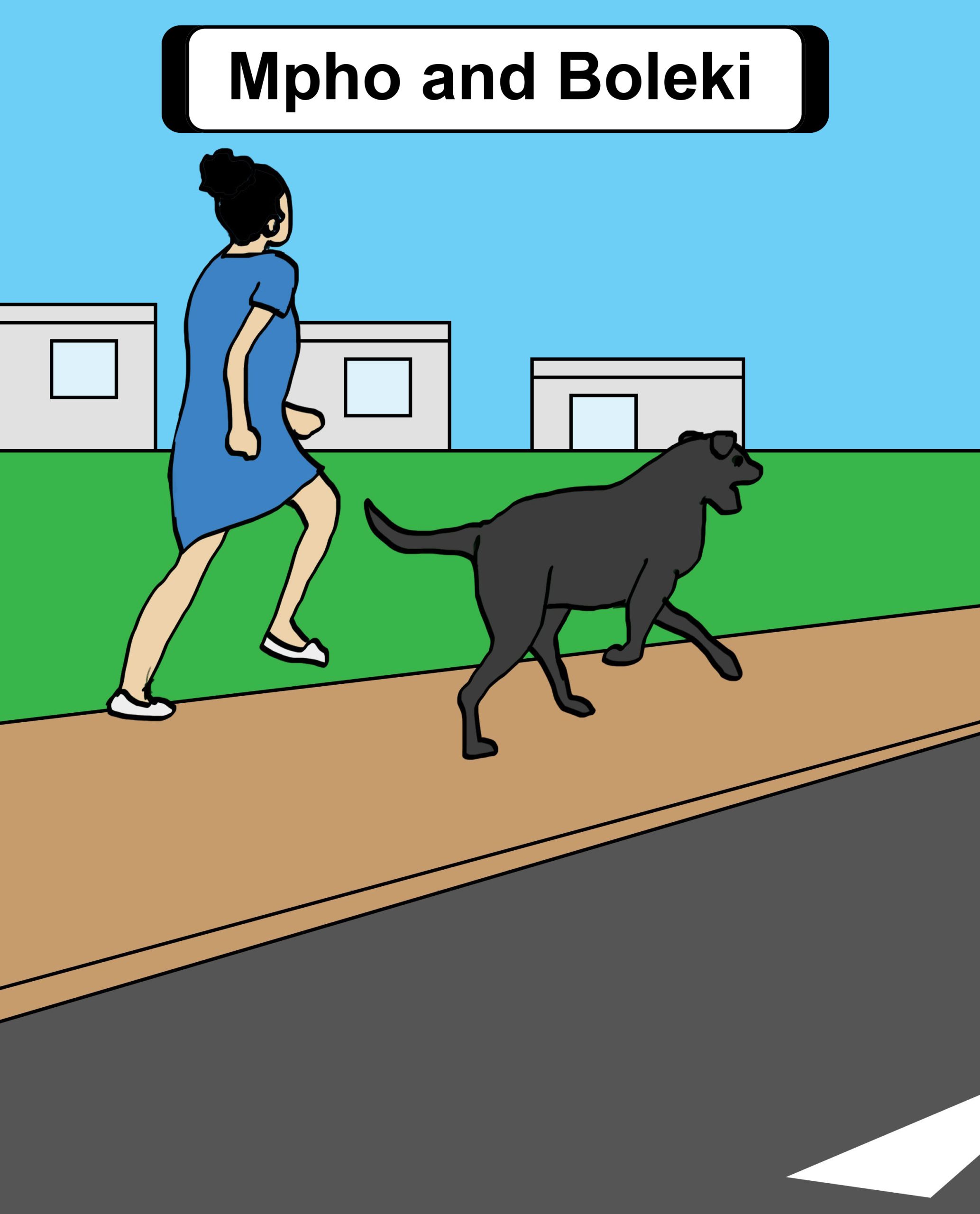 This is a story about love and loyalty between Mpho and her pet dog, Boleki. It is common for people to be very attached to animals. The story centers around a frightening episode where Boleki was almost knocked down by a car and narrowly escaped serious injury or worse, being killed. After the episode, Boleki refuses to cross the road again until Mpho coaxes him to a pedestrian crossing.